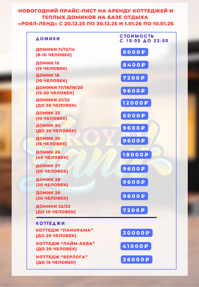 Домик с обогревом вместимостью до 20 чел. доплата с человека 300 руб., мангальная зона. Оснащен: ТВ-монитор, холодильник, тепловая завеса, микроволновая печь, кондиционер, стол, стулья, розетки. В стоимость домика не входит посещение бассейна.