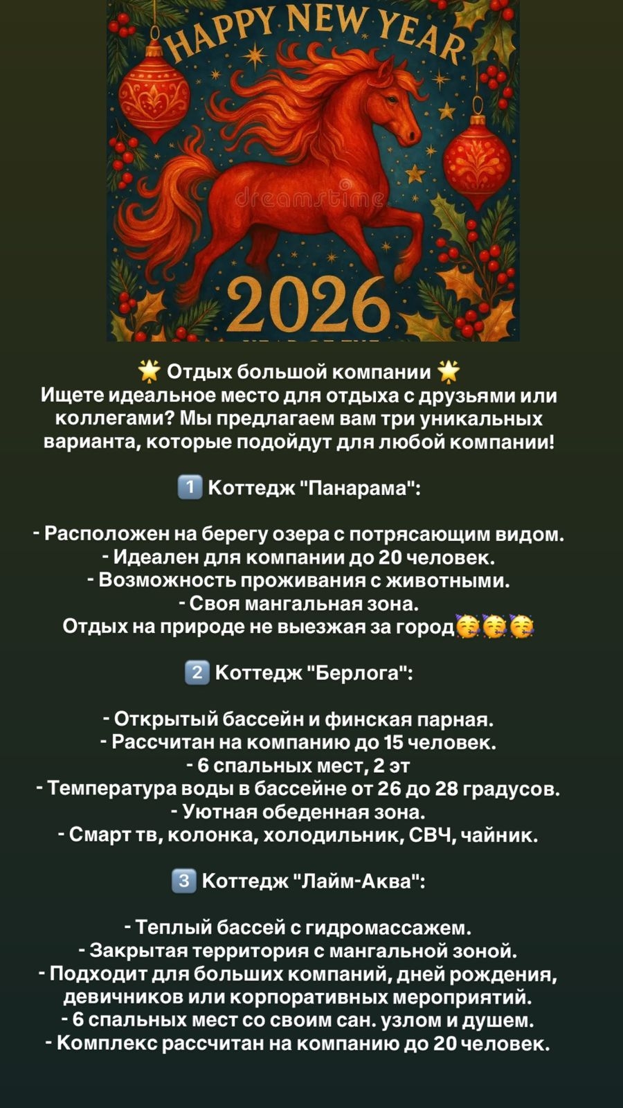 Домик с обогревом вместимостью до 20 чел. доплата с человека 300 руб., мангальная зона. Оснащен: ТВ-монитор, холодильник, тепловая завеса, микроволновая печь, кондиционер, стол, стулья, розетки. В стоимость домика не входит посещение бассейна.